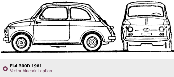 Raster blueprint of the 1961 Fiat 500D Tag. This free downloadable image can be used for graphic projects, digital design, and 3D modeling. The file provides accurate exterior proportions of the vehicle. Model year: 1961. Body type: Tag.