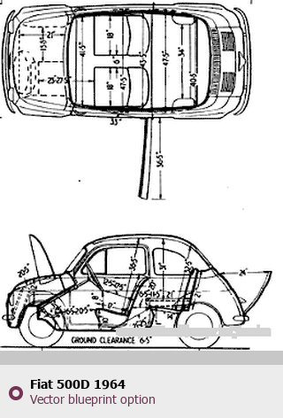 Raster blueprint of the 1964 Fiat 500D Tag. This free downloadable image can be used for graphic projects, digital design, and 3D modeling. The file provides accurate exterior proportions of the vehicle. Model year: 1964. Body type: Tag.
