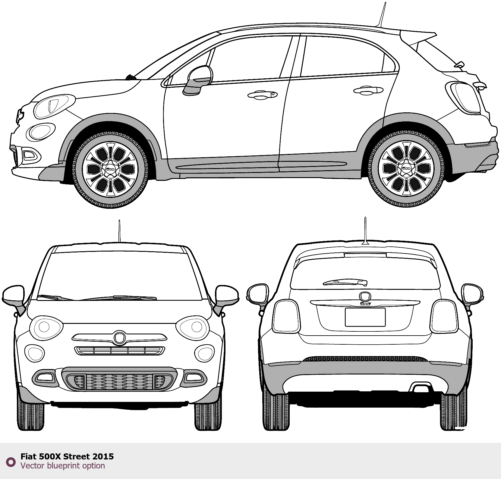 Raster blueprint of the 2015 Fiat 500X Street Wagon. This free downloadable image can be used for graphic projects, digital design, and 3D modeling. The file provides accurate exterior proportions of the vehicle. Model year: 2015. Body type: Wagon.