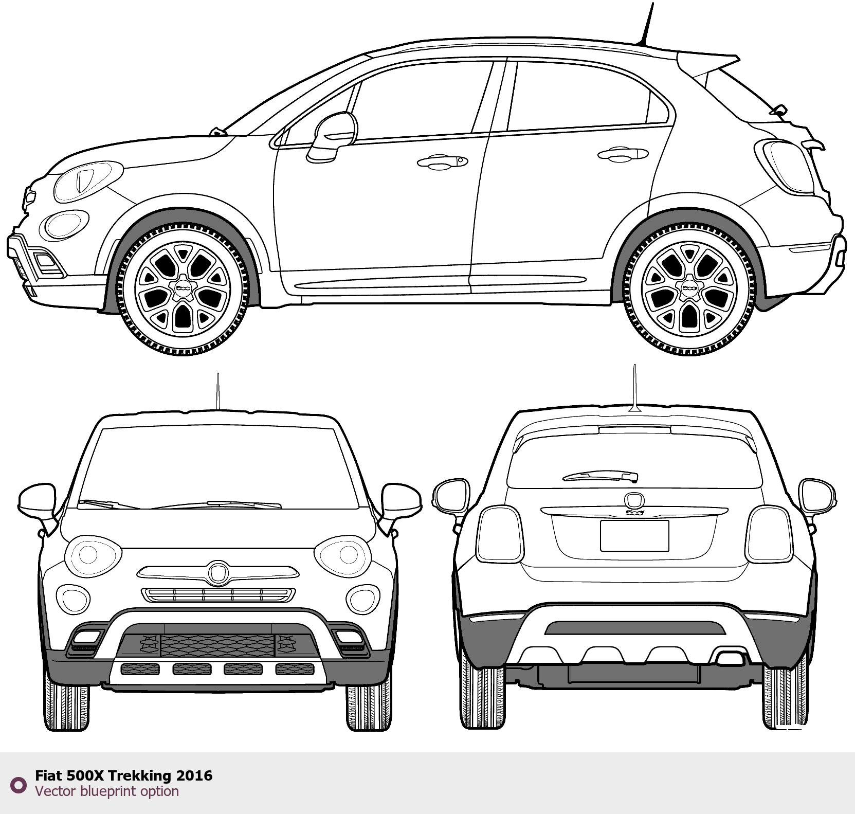 Raster blueprint of the 2016 Fiat 500X Trekking Wagon. This free downloadable image can be used for graphic projects, digital design, and 3D modeling. The file provides accurate exterior proportions of the vehicle. Model year: 2016. Body type: Wagon.