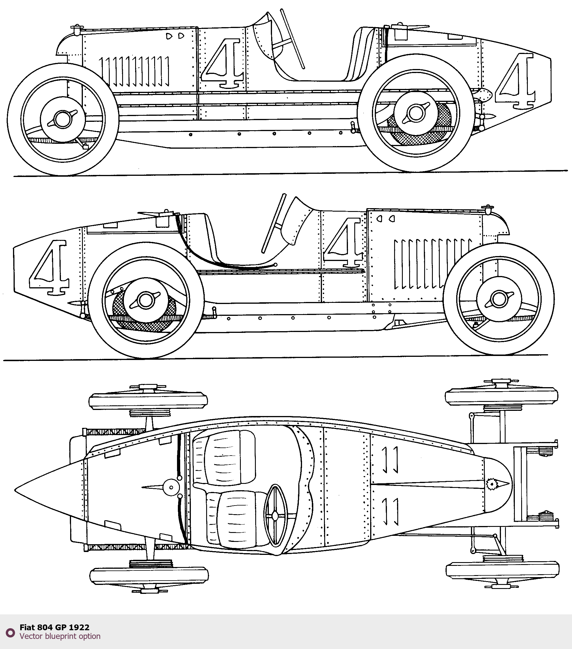 Raster blueprint of the 1922 Fiat 804 GP Tag. This free downloadable image can be used for graphic projects, digital design, and 3D modeling. The file provides accurate exterior proportions of the vehicle. Model year: 1922. Body type: Tag.