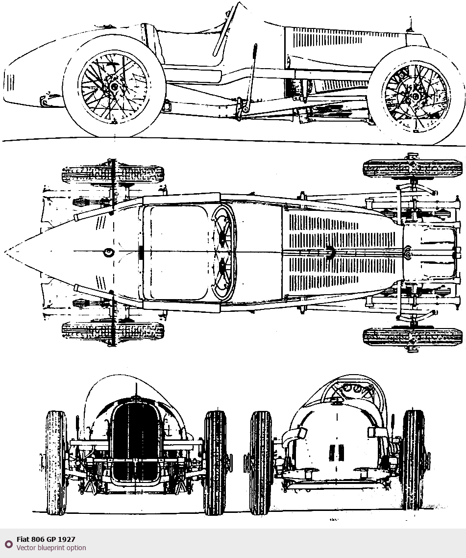 Raster blueprint of the 1927 Fiat 806 GP Tag. This free downloadable image can be used for graphic projects, digital design, and 3D modeling. The file provides accurate exterior proportions of the vehicle. Model year: 1927. Body type: Tag.