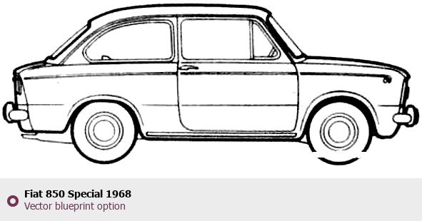 Raster blueprint of the 1968 Fiat 850 Special Tag. This free downloadable image can be used for graphic projects, digital design, and 3D modeling. The file provides accurate exterior proportions of the vehicle. Model year: 1968. Body type: Tag.