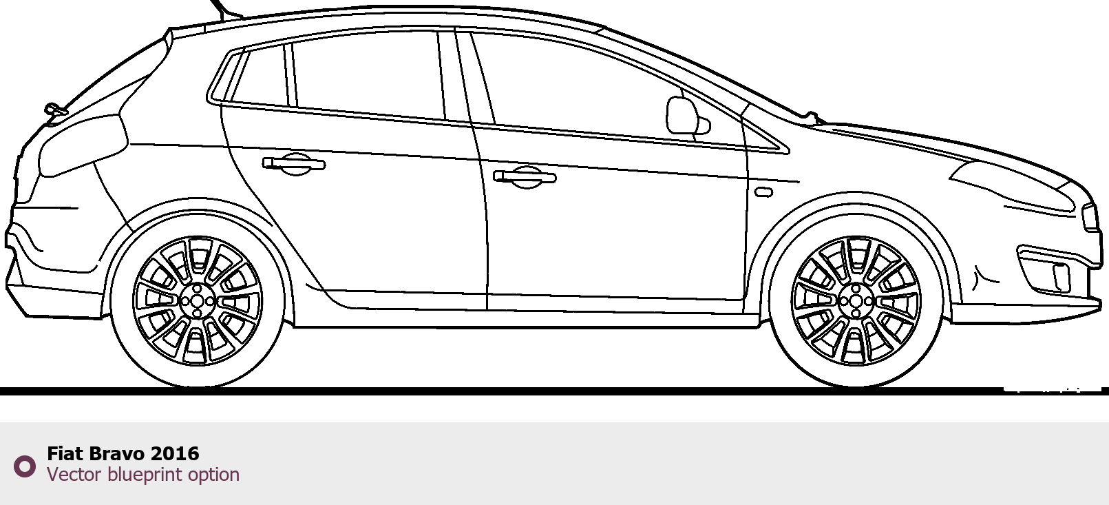 Raster blueprint of the 2016 Fiat Bravo Hatchback. This free downloadable image can be used for graphic projects, digital design, and 3D modeling. The file provides accurate exterior proportions of the vehicle. Model year: 2016. Body type: Hatchback.
