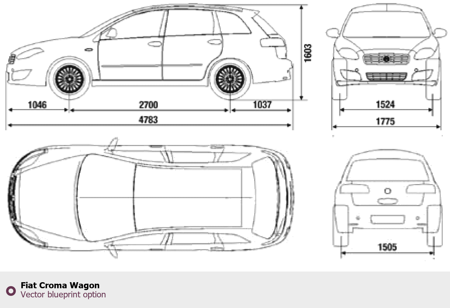 Raster blueprint of the Fiat Croma Wagon Wagon. This free downloadable image can be used for graphic projects, digital design, and 3D modeling. The file provides accurate exterior proportions of the vehicle. Body type: Wagon.