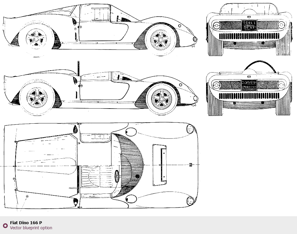 Raster blueprint of the Fiat Dino 166 P Coupe. This free downloadable image can be used for graphic projects, digital design, and 3D modeling. The file provides accurate exterior proportions of the vehicle. Body type: Coupe.