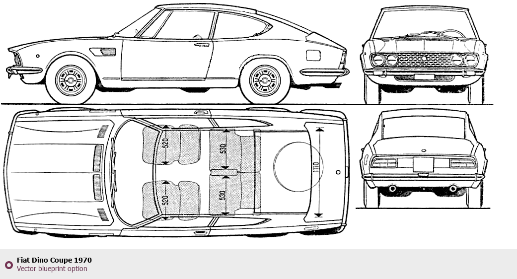 Raster blueprint of the 1970 Fiat Dino Coupe Coupe. This free downloadable image can be used for graphic projects, digital design, and 3D modeling. The file provides accurate exterior proportions of the vehicle. Model year: 1970. Body type: Coupe.