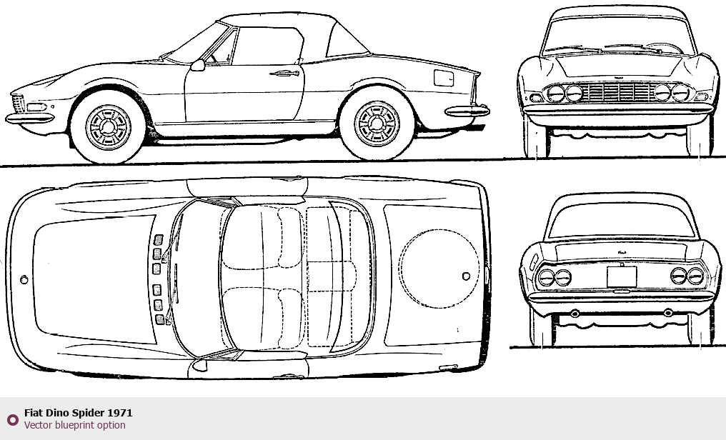 Raster blueprint of the 1971 Fiat Dino Spider Coupe. This free downloadable image can be used for graphic projects, digital design, and 3D modeling. The file provides accurate exterior proportions of the vehicle. Model year: 1971. Body type: Coupe.