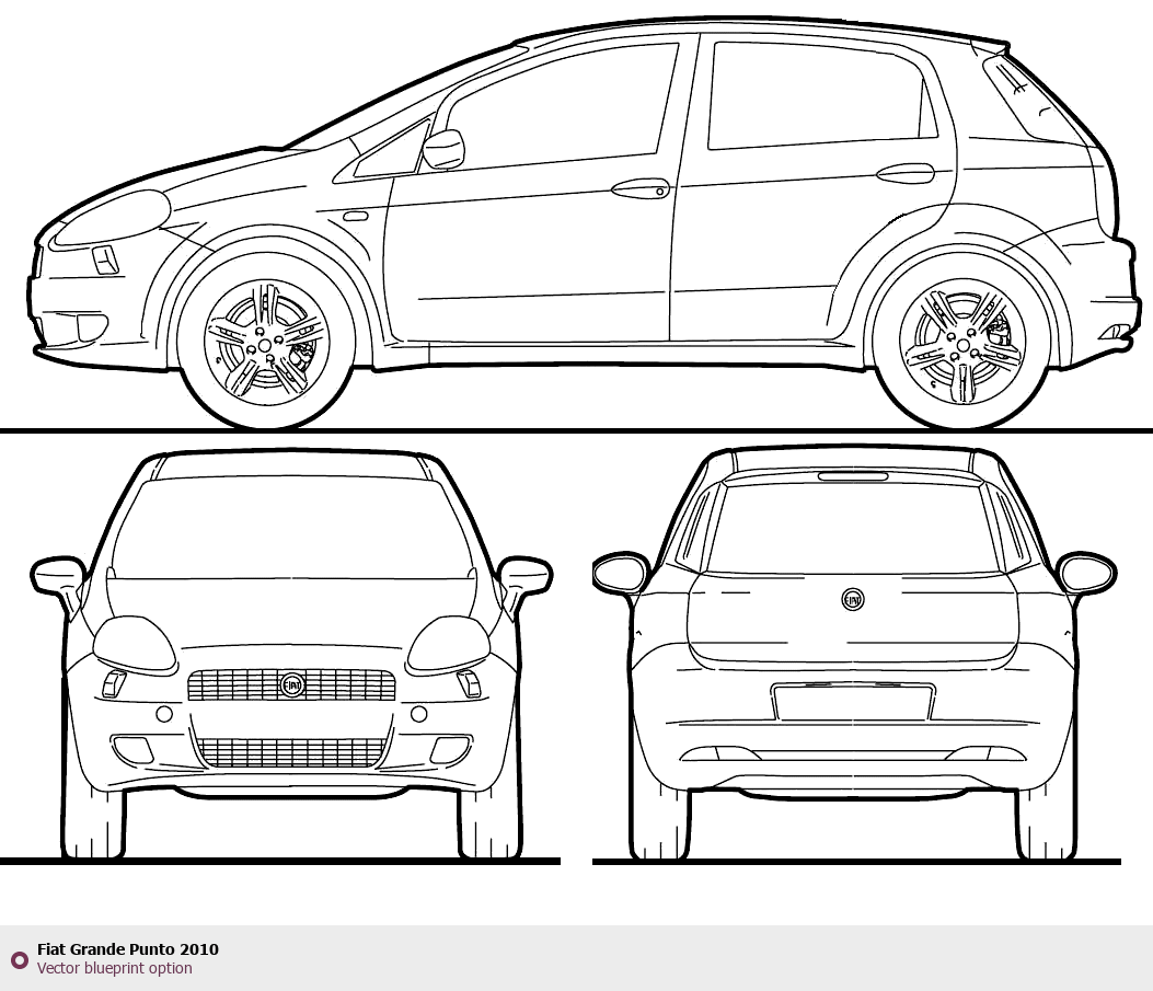 Raster blueprint of the 2010 Fiat Grande Punto Hatchback. This free downloadable image can be used for graphic projects, digital design, and 3D modeling. The file provides accurate exterior proportions of the vehicle. Model year: 2010. Body type: Hatchback.