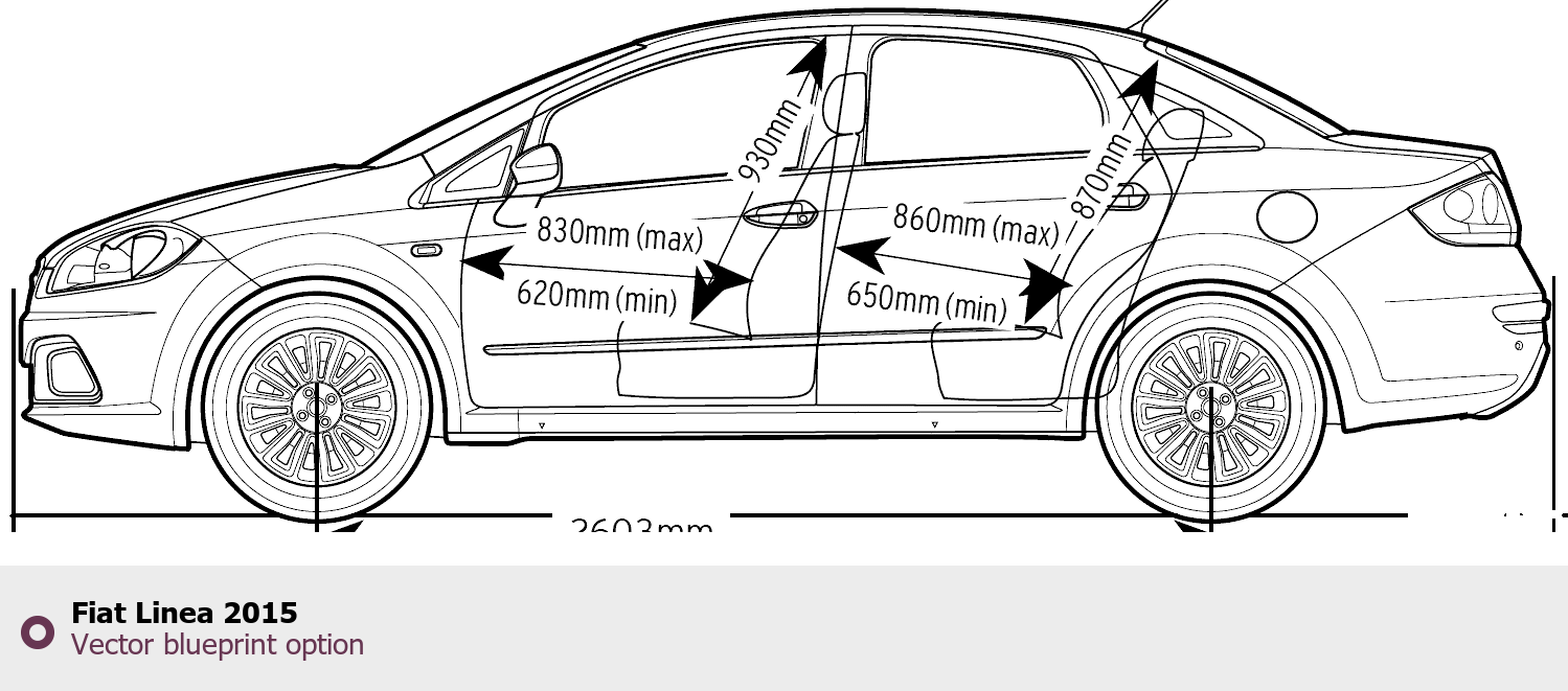 Raster blueprint of the 2015 Fiat Linea Sedan. This free downloadable image can be used for graphic projects, digital design, and 3D modeling. The file provides accurate exterior proportions of the vehicle. Model year: 2015. Body type: Sedan.