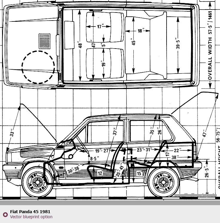 Raster blueprint of the 1981 Fiat Panda 45 Tag. This free downloadable image can be used for graphic projects, digital design, and 3D modeling. The file provides accurate exterior proportions of the vehicle. Model year: 1981. Body type: Tag.