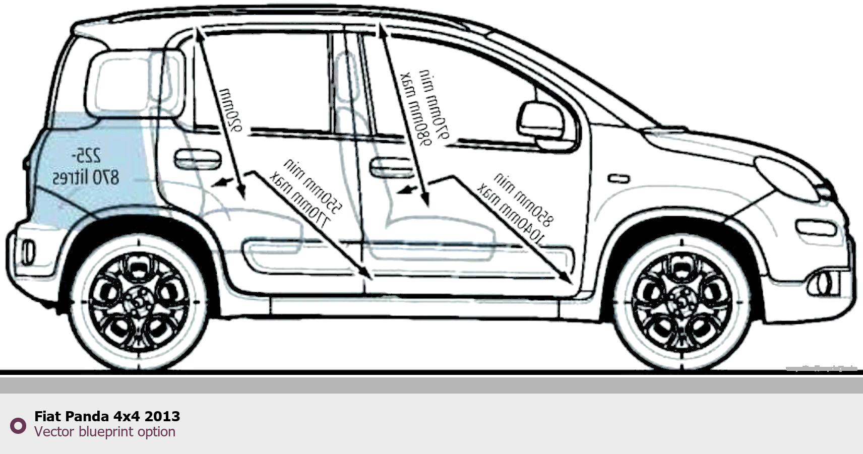 Raster blueprint of the 2013 Fiat Panda 4x4 Tag. This free downloadable image can be used for graphic projects, digital design, and 3D modeling. The file provides accurate exterior proportions of the vehicle. Model year: 2013. Body type: Tag.