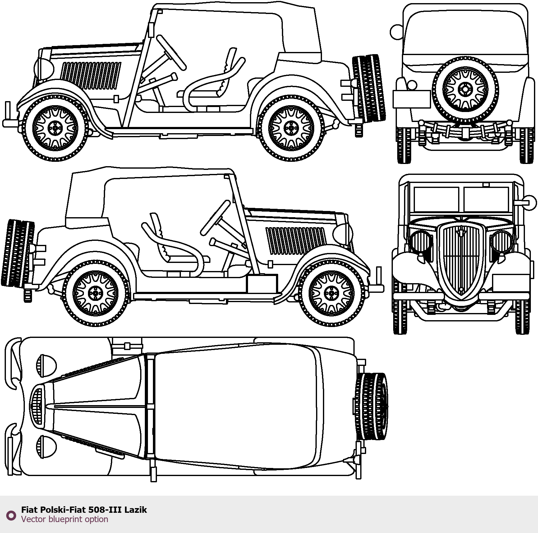 Raster blueprint of the Fiat Polski-Fiat 508-III Lazik Tag. This free downloadable image can be used for graphic projects, digital design, and 3D modeling. The file provides accurate exterior proportions of the vehicle. Body type: Tag.