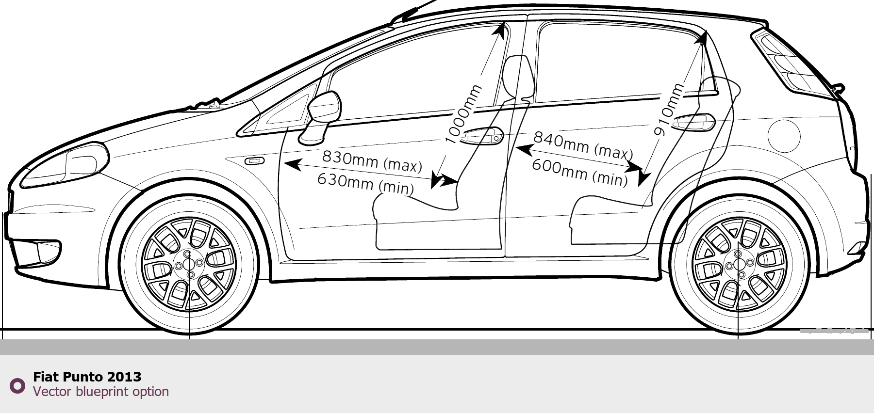 Raster blueprint of the 2013 Fiat Punto Tag. This free downloadable image can be used for graphic projects, digital design, and 3D modeling. The file provides accurate exterior proportions of the vehicle. Model year: 2013. Body type: Tag.