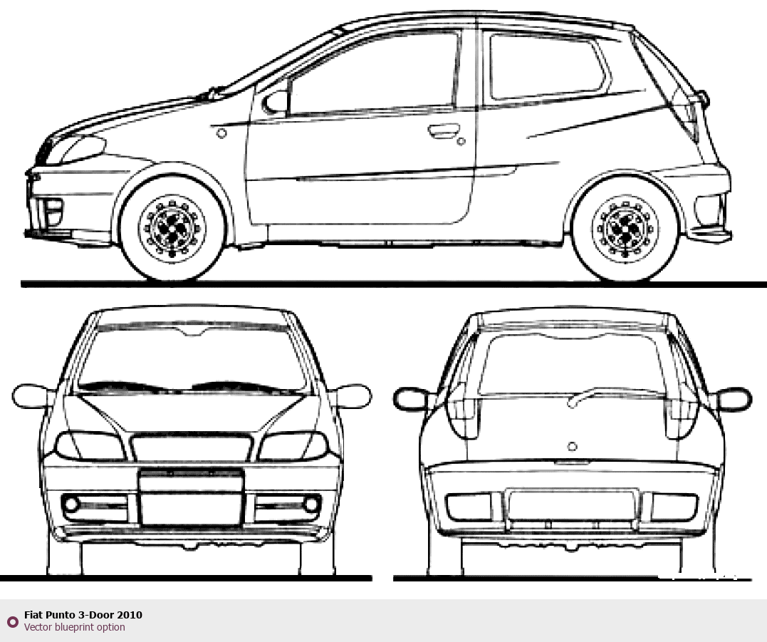 Raster blueprint of the 2010 Fiat Punto 3-Door Tag. This free downloadable image can be used for graphic projects, digital design, and 3D modeling. The file provides accurate exterior proportions of the vehicle. Model year: 2010. Body type: Tag.