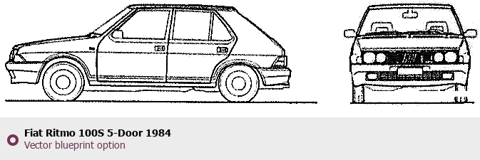 Raster blueprint of the 1984 Fiat Ritmo 100S 5-Door Tag. This free downloadable image can be used for graphic projects, digital design, and 3D modeling. The file provides accurate exterior proportions of the vehicle. Model year: 1984. Body type: Tag.