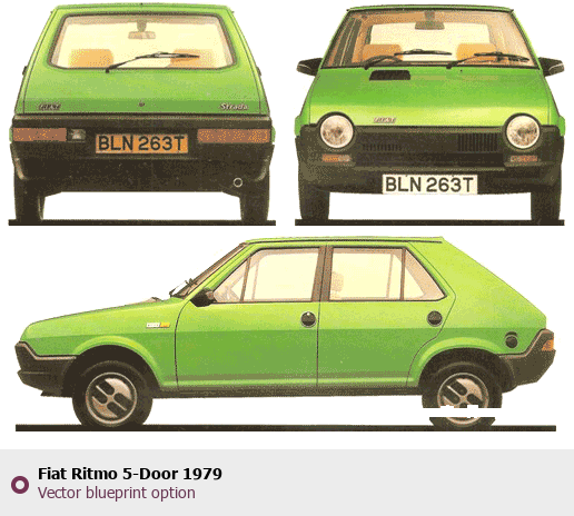 Raster blueprint of the 1979 Fiat Ritmo 5-Door Tag. This free downloadable image can be used for graphic projects, digital design, and 3D modeling. The file provides accurate exterior proportions of the vehicle. Model year: 1979. Body type: Tag.
