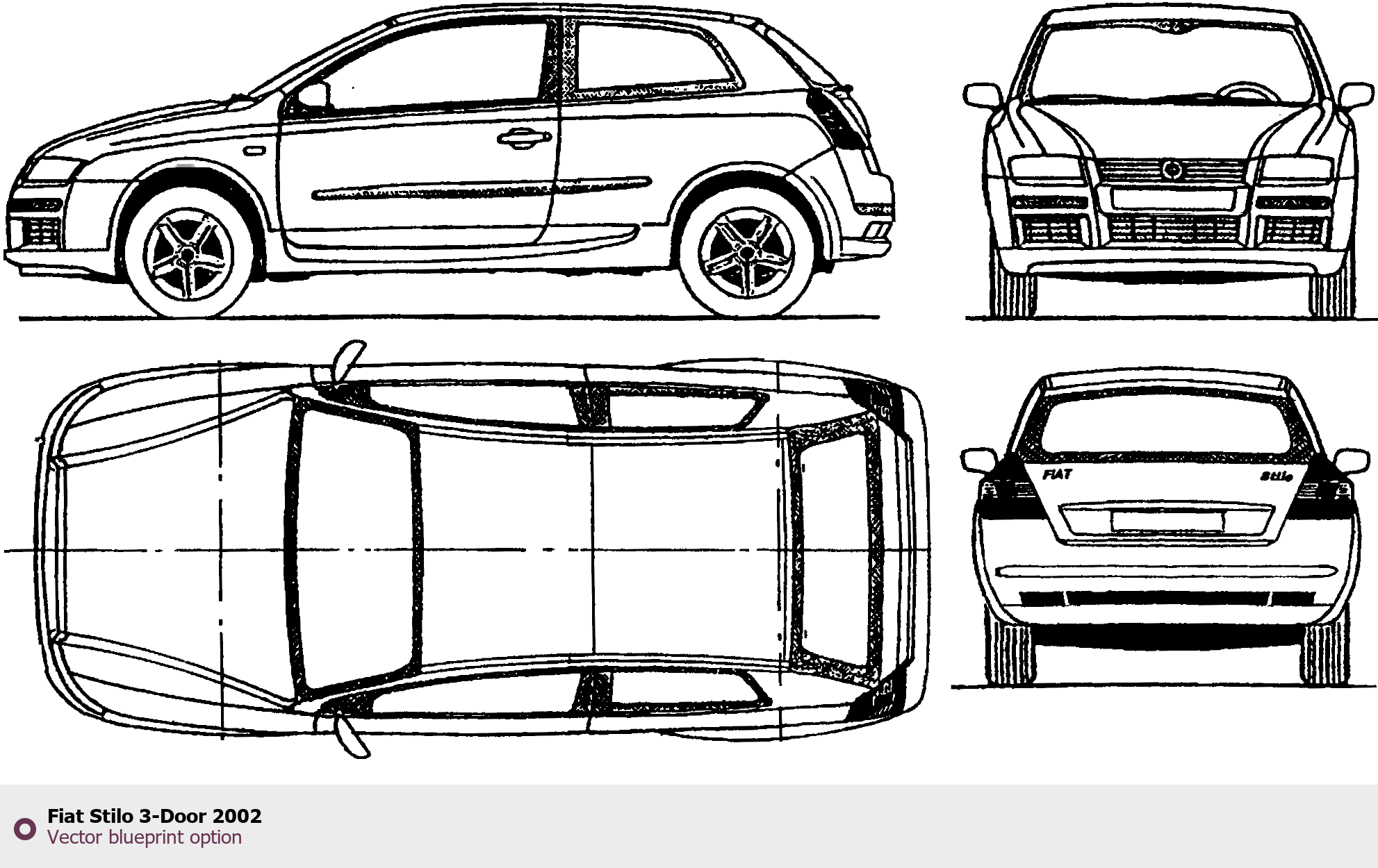 Raster blueprint of the 2002 Fiat Stilo 3-Door Tag. This free downloadable image can be used for graphic projects, digital design, and 3D modeling. The file provides accurate exterior proportions of the vehicle. Model year: 2002. Body type: Tag.