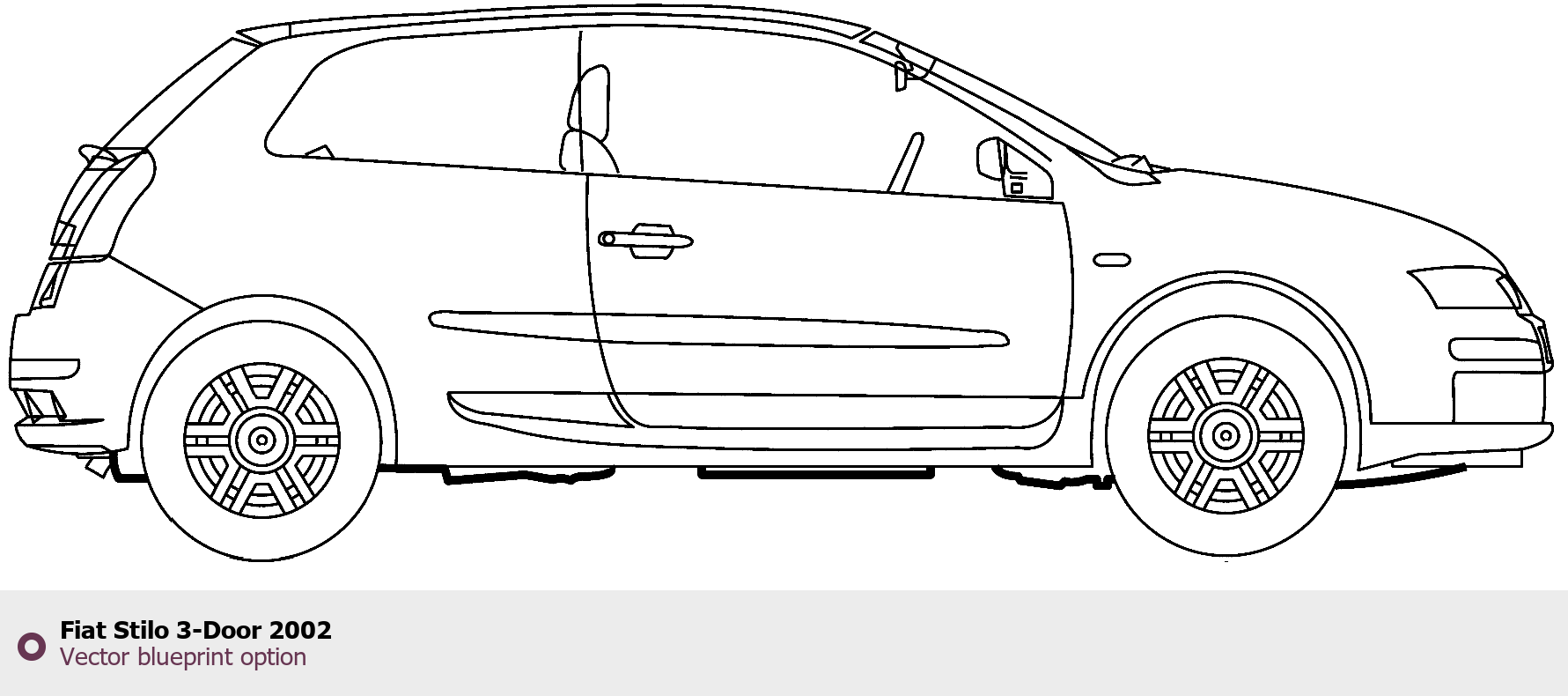 Raster blueprint of the 2002 Fiat Stilo 3-Door Tag. This free downloadable image can be used for graphic projects, digital design, and 3D modeling. The file provides accurate exterior proportions of the vehicle. Model year: 2002. Body type: Tag.