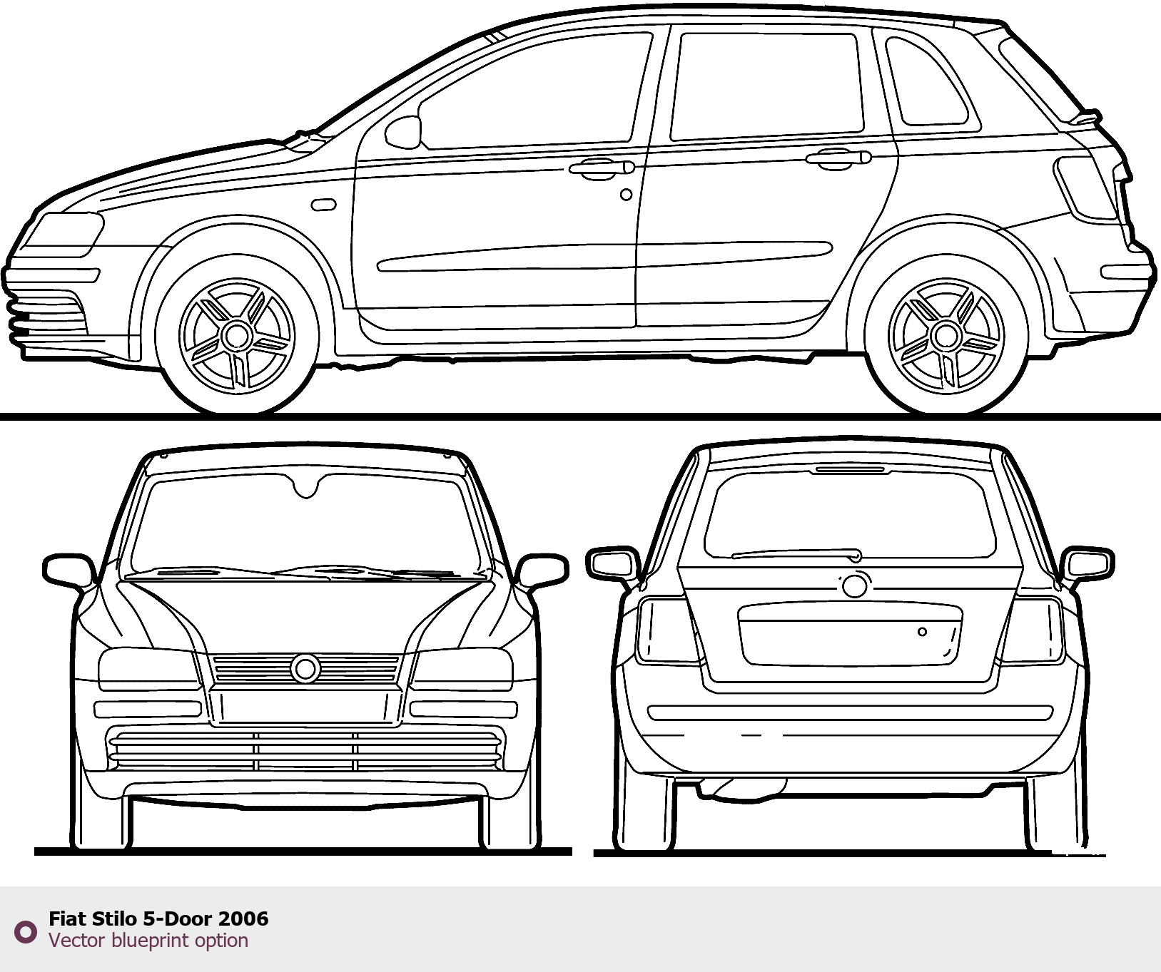 Raster blueprint of the 2006 Fiat Stilo 5-Door Tag. This free downloadable image can be used for graphic projects, digital design, and 3D modeling. The file provides accurate exterior proportions of the vehicle. Model year: 2006. Body type: Tag.