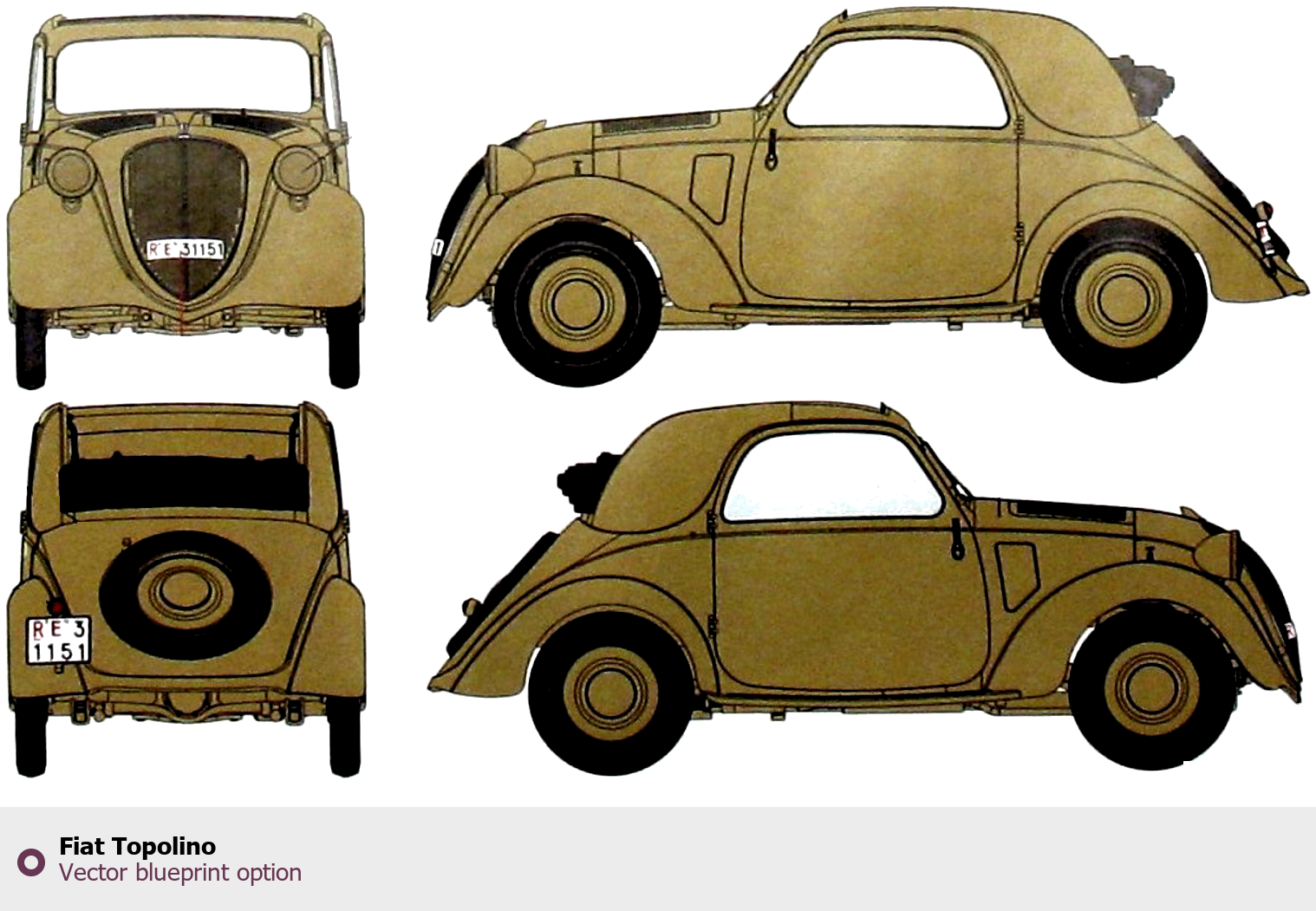 Raster blueprint of the Fiat Topolino Tag. This free downloadable image can be used for graphic projects, digital design, and 3D modeling. The file provides accurate exterior proportions of the vehicle. Body type: Tag.