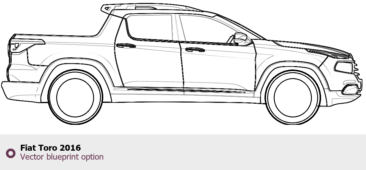 Raster blueprint of the 2016 Fiat Toro Tag. This free downloadable image can be used for graphic projects, digital design, and 3D modeling. The file provides accurate exterior proportions of the vehicle. Model year: 2016. Body type: Tag.