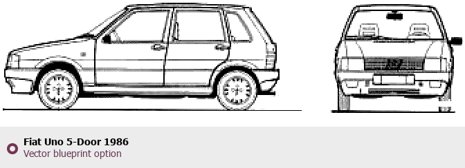 Raster blueprint of the 1986 Fiat Uno 5-Door Hatchback. This free downloadable image can be used for graphic projects, digital design, and 3D modeling. The file provides accurate exterior proportions of the vehicle. Model year: 1986. Body type: Hatchback.