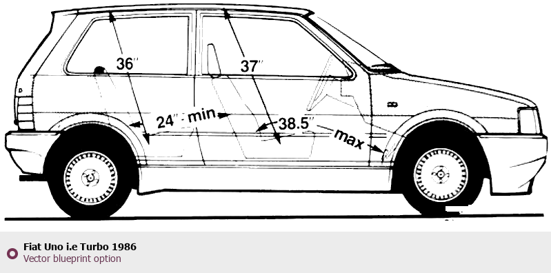 Raster blueprint of the 1986 Fiat Uno i.e Turbo Hatchback. This free downloadable image can be used for graphic projects, digital design, and 3D modeling. The file provides accurate exterior proportions of the vehicle. Model year: 1986. Body type: Hatchback.