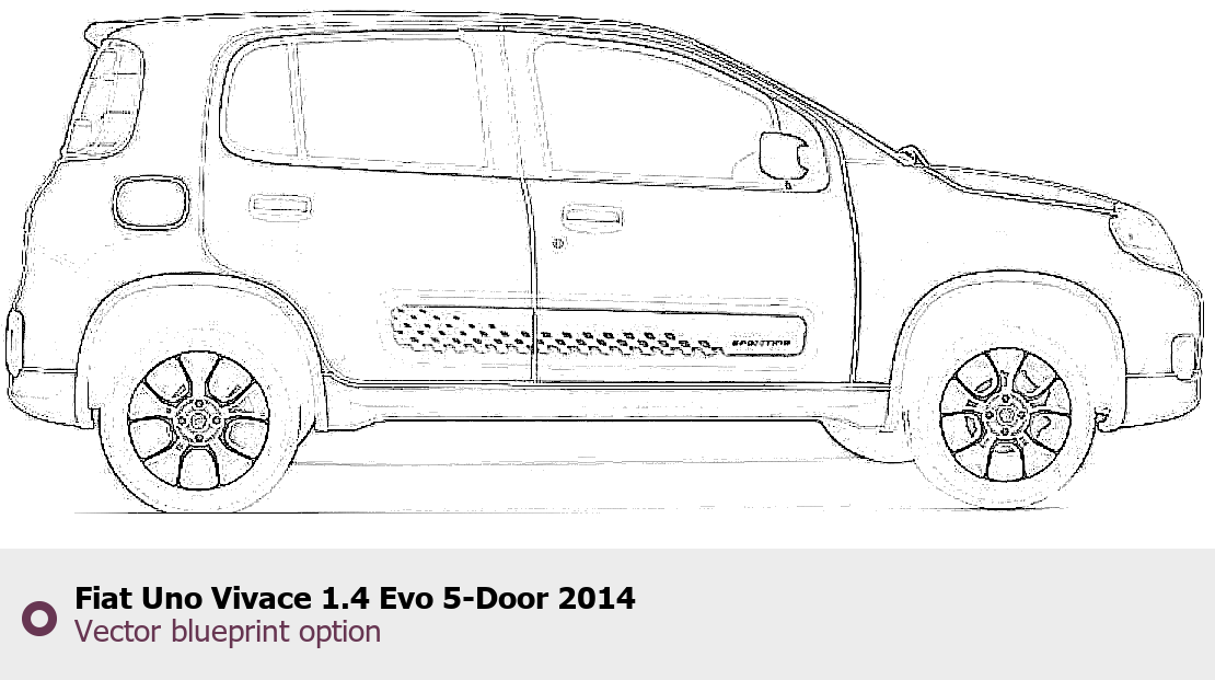 Raster blueprint of the 2014 Fiat Uno Vivace 1.4 Evo 5-Door Hatchback. This free downloadable image can be used for graphic projects, digital design, and 3D modeling. The file provides accurate exterior proportions of the vehicle. Model year: 2014. Body type: Hatchback.