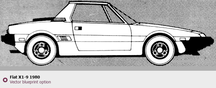 Raster blueprint of the 1980 Fiat X1-9 Tag. This free downloadable image can be used for graphic projects, digital design, and 3D modeling. The file provides accurate exterior proportions of the vehicle. Model year: 1980. Body type: Tag.