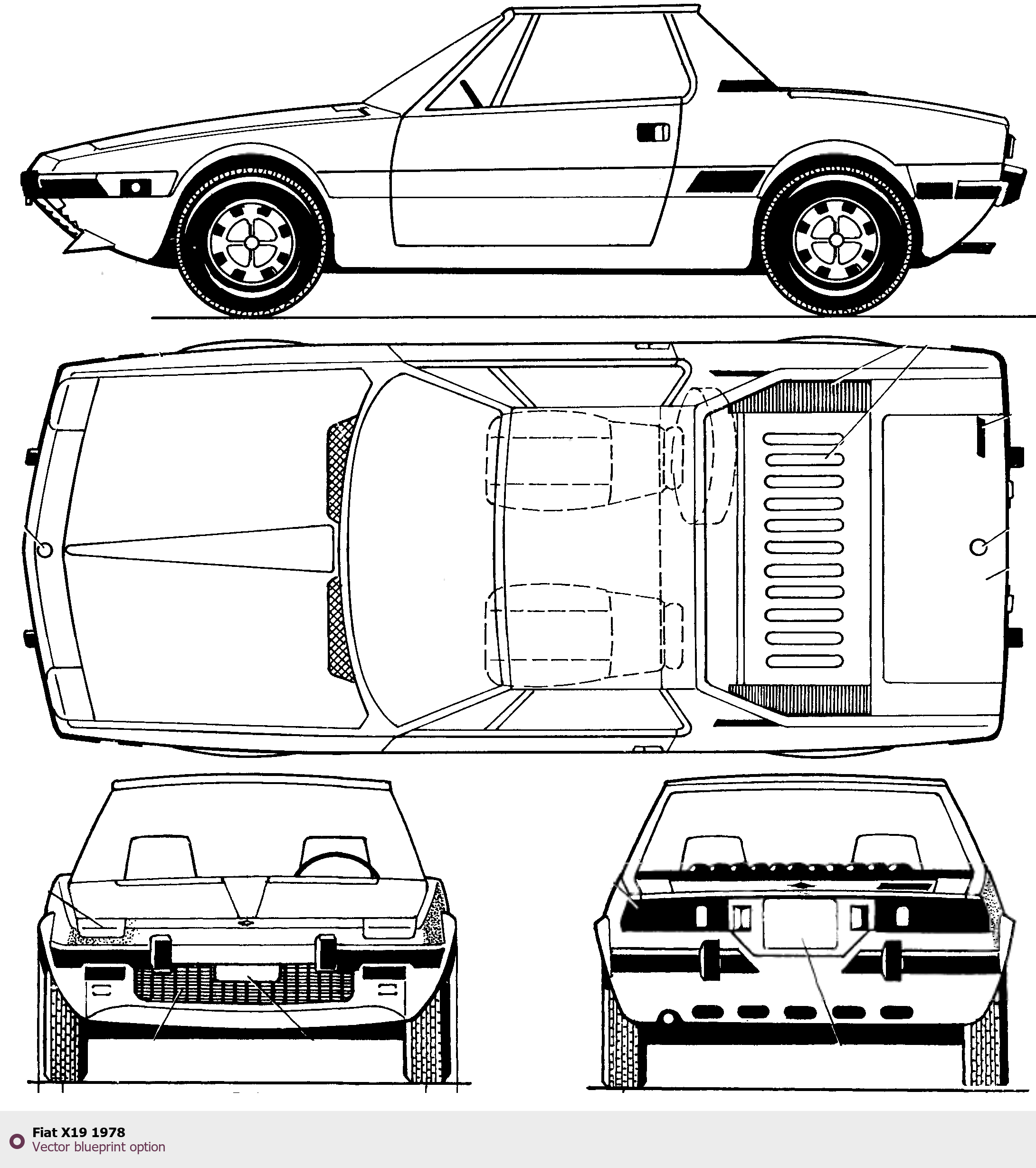 Raster blueprint of the 1978 Fiat X19 Tag. This free downloadable image can be used for graphic projects, digital design, and 3D modeling. The file provides accurate exterior proportions of the vehicle. Model year: 1978. Body type: Tag.