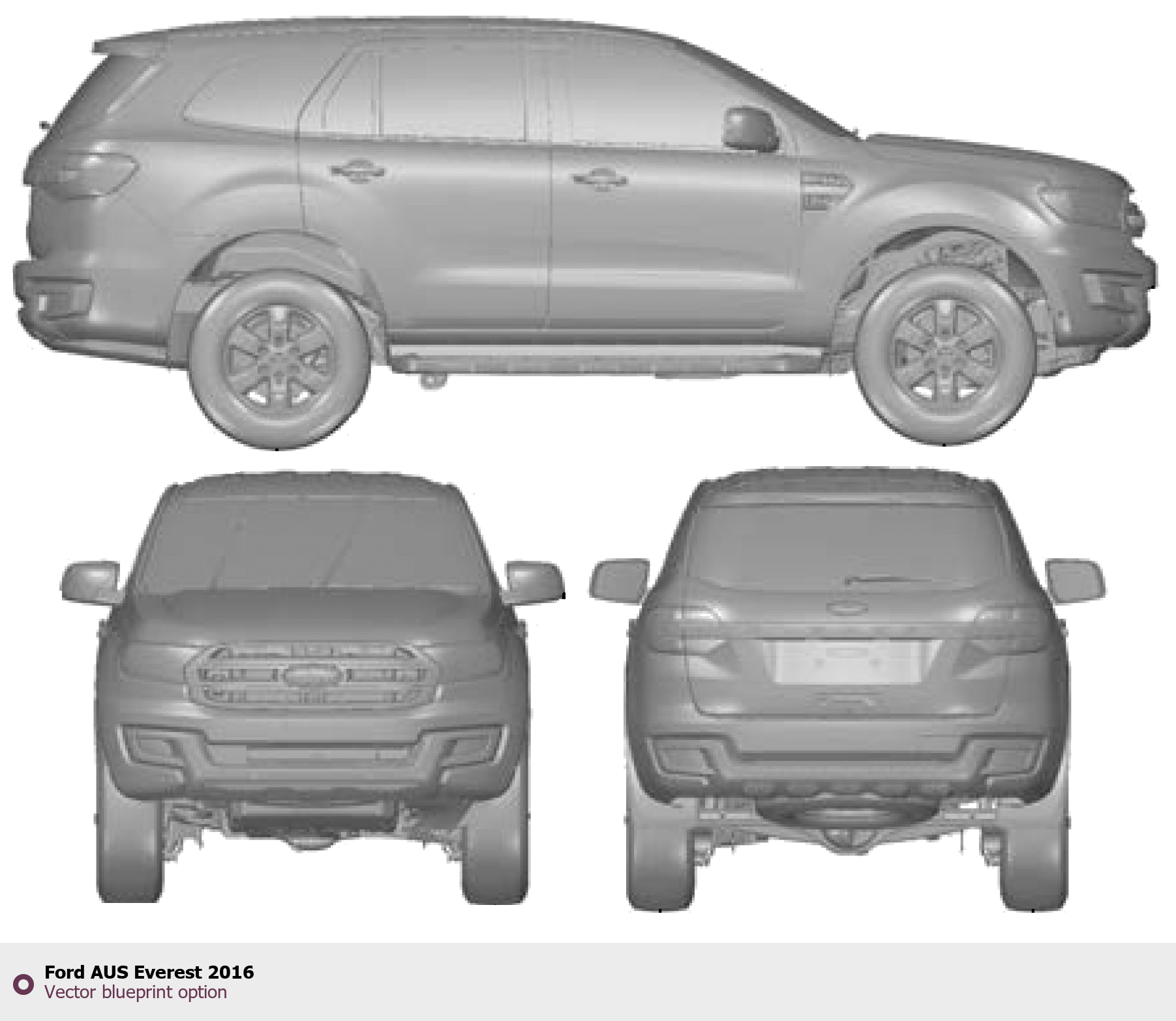 Raster blueprint of the 2016 Ford AUS Everest SUV. This free downloadable image can be used for graphic projects, digital design, and 3D modeling. The file provides accurate exterior proportions of the vehicle. Model year: 2016. Body type: SUV.