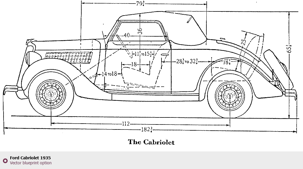 Raster blueprint of the 1935 Ford Cabriolet Cabriolet. This free downloadable image can be used for graphic projects, digital design, and 3D modeling. The file provides accurate exterior proportions of the vehicle. Model year: 1935. Body type: Cabriolet.
