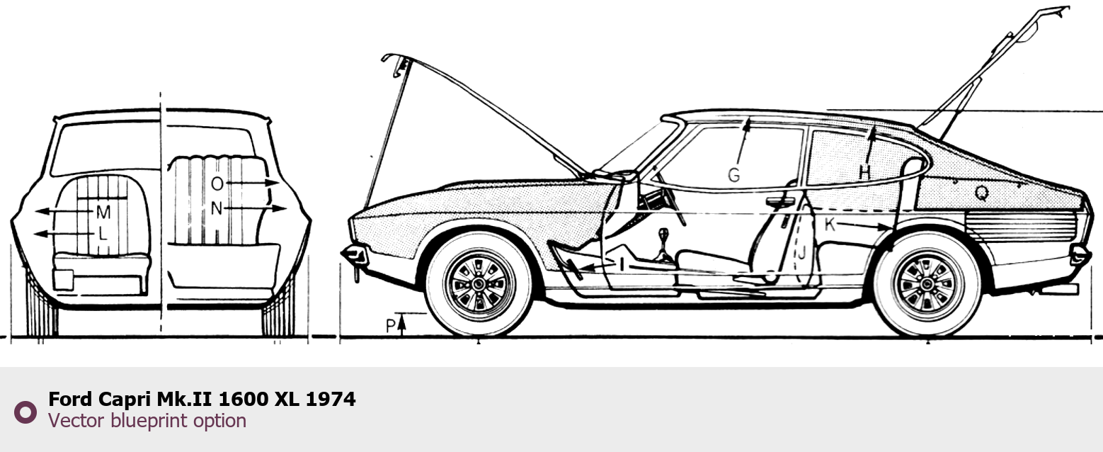 Raster blueprint of the 1974 Ford Capri Mk.II 1600 XL Tag. This free downloadable image can be used for graphic projects, digital design, and 3D modeling. The file provides accurate exterior proportions of the vehicle. Model year: 1974. Body type: Tag.