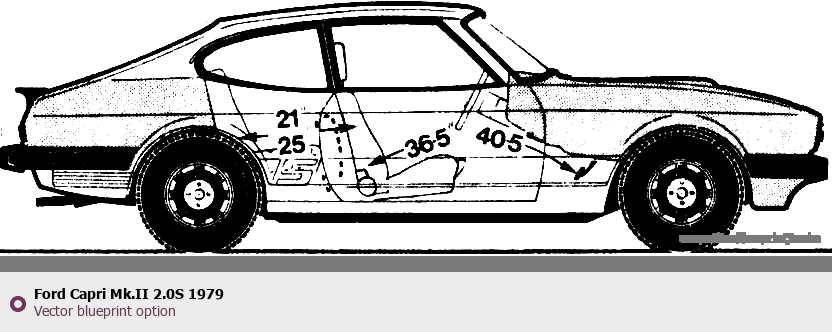 Raster blueprint of the 1979 Ford Capri Mk.II 2.0S Tag. This free downloadable image can be used for graphic projects, digital design, and 3D modeling. The file provides accurate exterior proportions of the vehicle. Model year: 1979. Body type: Tag.