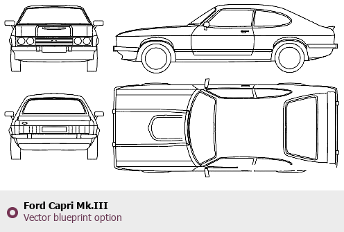 Raster blueprint of the Ford Capri Mk.III Tag. This free downloadable image can be used for graphic projects, digital design, and 3D modeling. The file provides accurate exterior proportions of the vehicle. Body type: Tag.