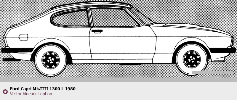 Raster blueprint of the 1980 Ford Capri Mk.IIII 1300 L Tag. This free downloadable image can be used for graphic projects, digital design, and 3D modeling. The file provides accurate exterior proportions of the vehicle. Model year: 1980. Body type: Tag.