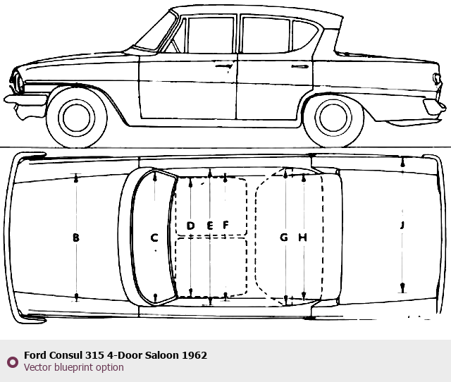 Raster blueprint of the 1962 Ford Consul 315 4-Door Saloon Sedan. This free downloadable image can be used for graphic projects, digital design, and 3D modeling. The file provides accurate exterior proportions of the vehicle. Model year: 1962. Body type: Sedan.