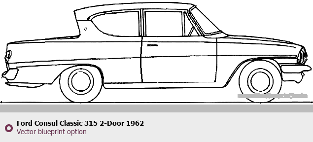 Raster blueprint of the 1962 Ford Consul Classic 315 2-Door Tag. This free downloadable image can be used for graphic projects, digital design, and 3D modeling. The file provides accurate exterior proportions of the vehicle. Model year: 1962. Body type: Tag.