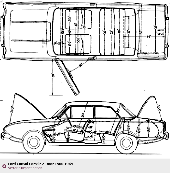 Raster blueprint of the 1964 Ford Consul Corsair 2-Door 1500 Tag. This free downloadable image can be used for graphic projects, digital design, and 3D modeling. The file provides accurate exterior proportions of the vehicle. Model year: 1964. Body type: Tag.