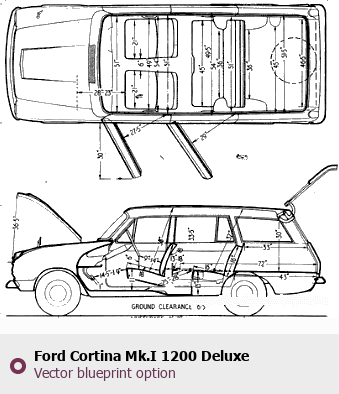 Raster blueprint of the 1963 Ford Cortina Mk.I 1200 Deluxe Estate Wagon. This free downloadable image can be used for graphic projects, digital design, and 3D modeling. The file provides accurate exterior proportions of the vehicle. Model year: 1963. Body type: Wagon.
