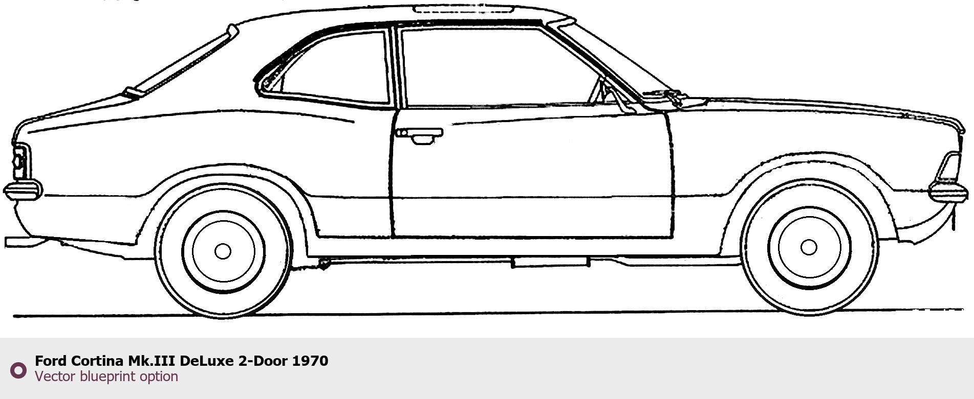 Raster blueprint of the 1970 Ford Cortina Mk.III DeLuxe 2-Door Tag. This free downloadable image can be used for graphic projects, digital design, and 3D modeling. The file provides accurate exterior proportions of the vehicle. Model year: 1970. Body type: Tag.