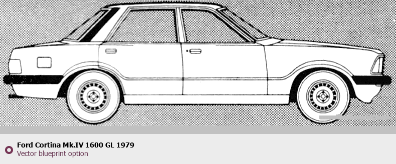 Raster blueprint of the 1979 Ford Cortina Mk.IV 1600 GL Tag. This free downloadable image can be used for graphic projects, digital design, and 3D modeling. The file provides accurate exterior proportions of the vehicle. Model year: 1979. Body type: Tag.