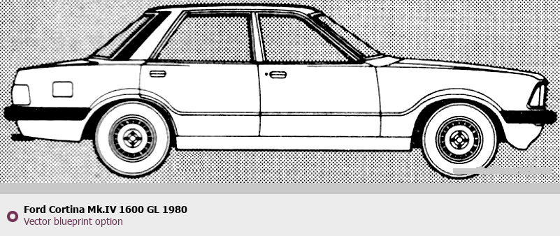 Raster blueprint of the 1980 Ford Cortina Mk.IV 1600 GL Tag. This free downloadable image can be used for graphic projects, digital design, and 3D modeling. The file provides accurate exterior proportions of the vehicle. Model year: 1980. Body type: Tag.