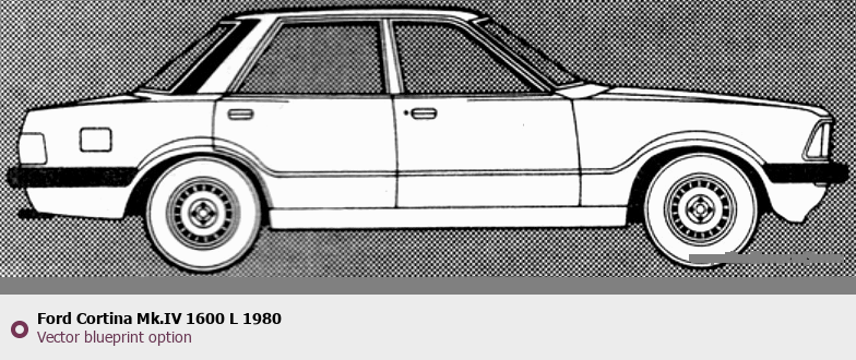 Raster blueprint of the 1980 Ford Cortina Mk.IV 1600 L Tag. This free downloadable image can be used for graphic projects, digital design, and 3D modeling. The file provides accurate exterior proportions of the vehicle. Model year: 1980. Body type: Tag.