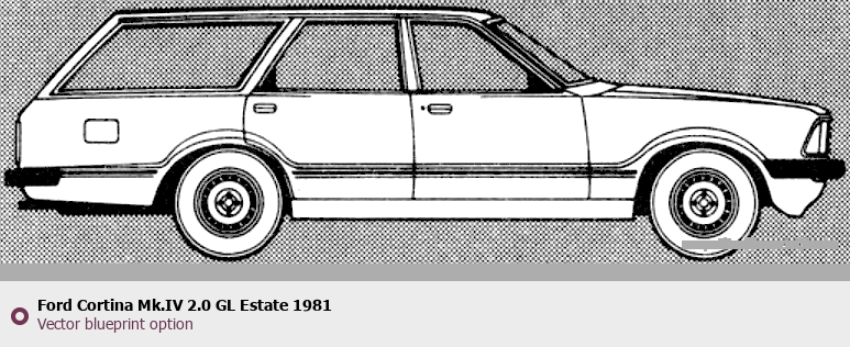 Raster blueprint of the 1981 Ford Cortina Mk.IV 2.0 GL Estate Wagon. This free downloadable image can be used for graphic projects, digital design, and 3D modeling. The file provides accurate exterior proportions of the vehicle. Model year: 1981. Body type: Wagon.