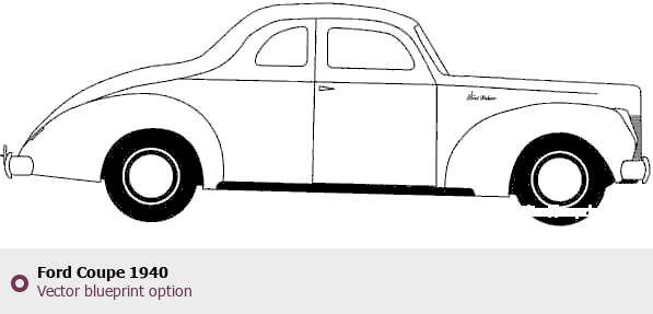 Raster blueprint of the 1940 Ford Coupe Coupe. This free downloadable image can be used for graphic projects, digital design, and 3D modeling. The file provides accurate exterior proportions of the vehicle. Model year: 1940. Body type: Coupe.