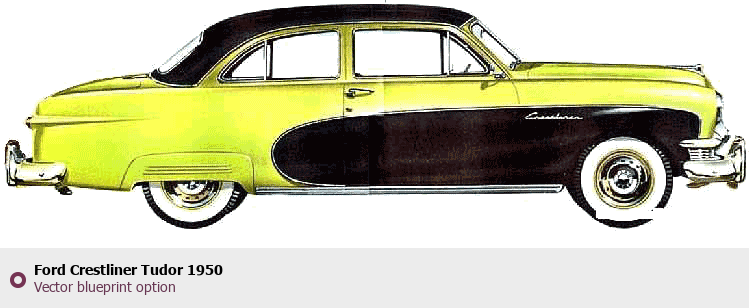 Raster blueprint of the 1950 Ford Crestliner Tudor Tag. This free downloadable image can be used for graphic projects, digital design, and 3D modeling. The file provides accurate exterior proportions of the vehicle. Model year: 1950. Body type: Tag.