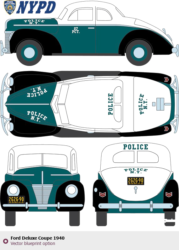 Raster blueprint of the 1940 Ford Deluxe Coupe Coupe. This free downloadable image can be used for graphic projects, digital design, and 3D modeling. The file provides accurate exterior proportions of the vehicle. Model year: 1940. Body type: Coupe.