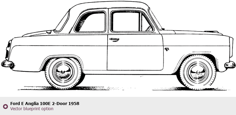 Raster blueprint of the 1958 Ford E Anglia 100E 2-Door Tag. This free downloadable image can be used for graphic projects, digital design, and 3D modeling. The file provides accurate exterior proportions of the vehicle. Model year: 1958. Body type: Tag.